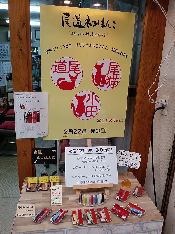 まだハンコをもっていない0歳児。せっかくなので初めての尾道旅でつくることに。色やネコの柄は3歳児が選んでくれました。5分程で注文出来ます。