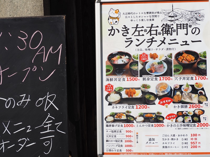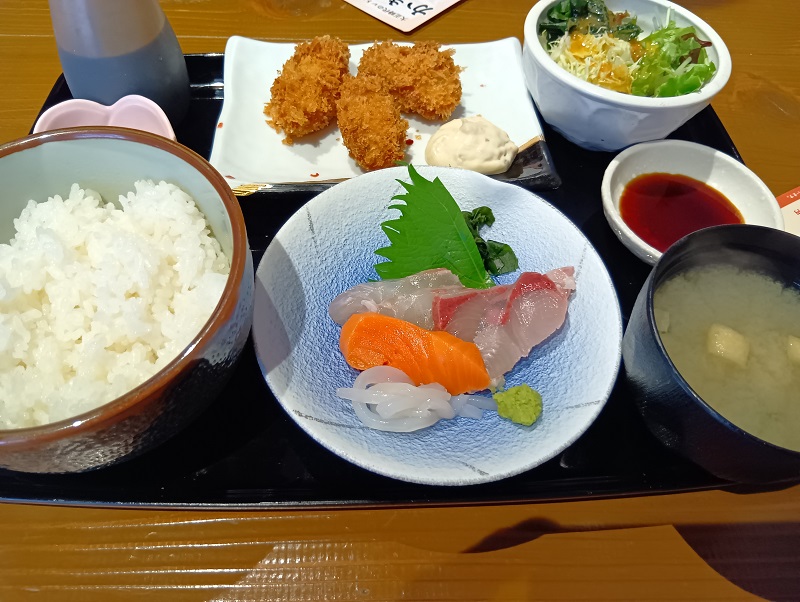 昼食は「かき左右衛門」でぷりぷりの牡蠣フライとお刺身定食
