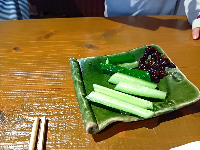 ランチが来るまでにお腹が空いた~と騒ぐ3歳児。サイドメニューのキュウリを齧って落ち着いてもらいます。