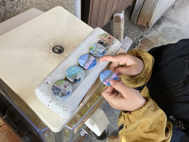 ほっこりする絵の缶バッチが旅の最初のお土産になりました。