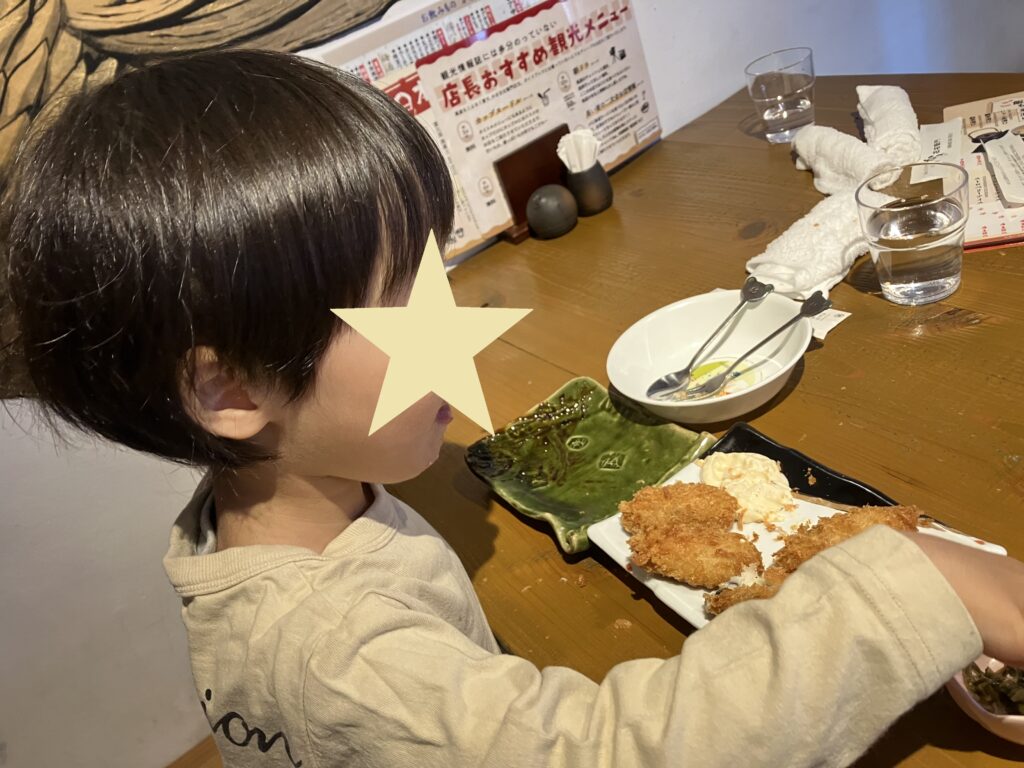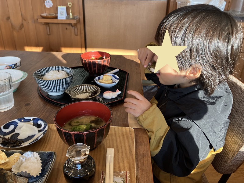 3歳児はご飯とお味噌汁セットです。お魚やサラダはシェアしました。