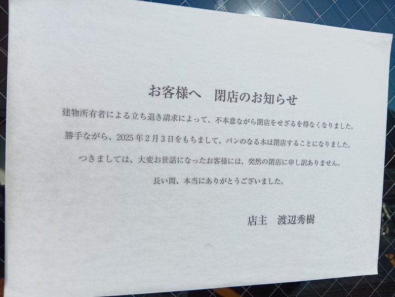 朝食を終えて、お隣のパン屋さん「パンのなる木」でランチ用のパンを買おうと楽しみにしていたらまさかの閉店のお知らせが貼られていました。
