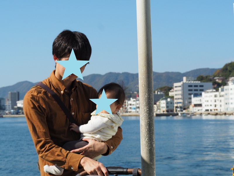 父に抱っこされて、はじめて船に乗って海に揺られる0歳児。